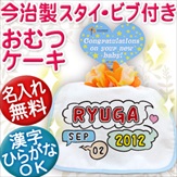 今治製ビブ(よだれかけ)付きの1段おむつケーキです。 ビブは今治製の生地を使用しており、ノーマルタイプよりもひとまわり程サイズも大きくなっております。ちょっとしたお祝い、プチギフトに最適です♪