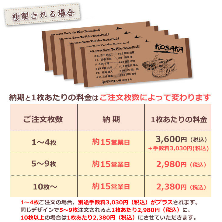 納期はデザインが確定した日から起算しています。デザイン作成に必要な情報がすぐに頂けない場合はお届けが遅れますので予めご了承ください。