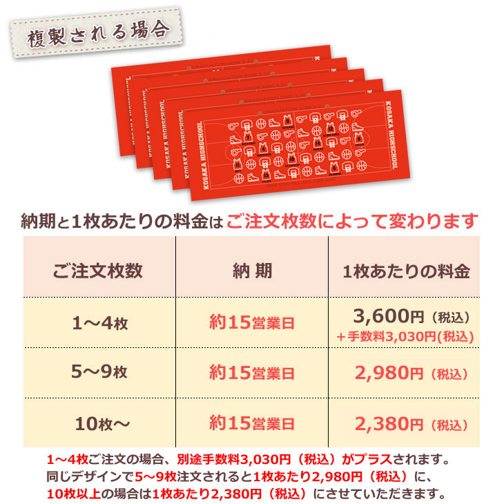 納期はデザインが確定した日から起算しています。デザイン作成に必要な情報がすぐに頂けない場合はお届けが遅れますので予めご了承ください。