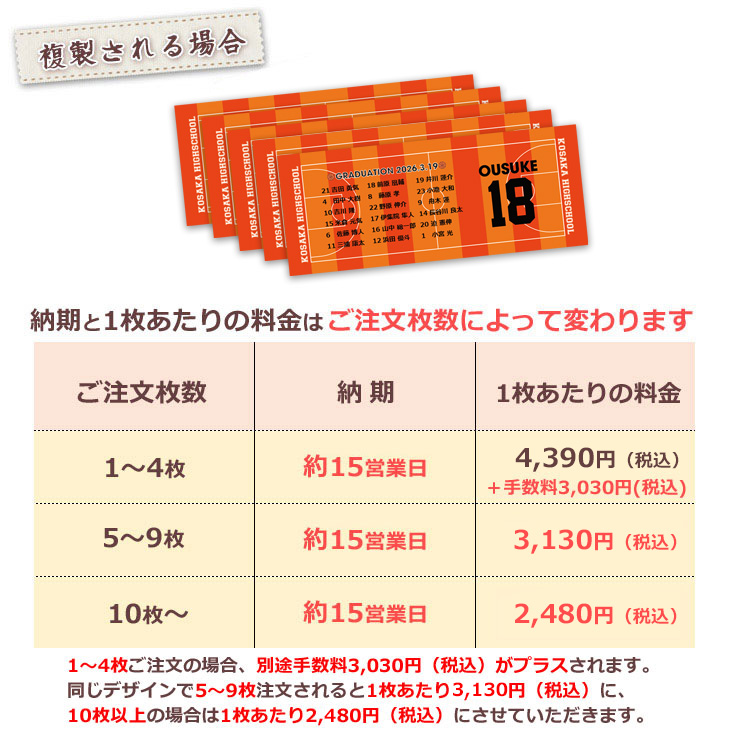 納期はデザインが確定した日から起算しています。デザイン作成に必要な情報がすぐに頂けない場合はお届けが遅れますので予めご了承ください。
