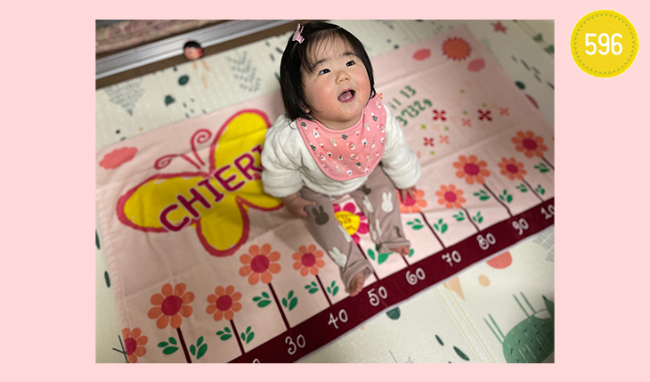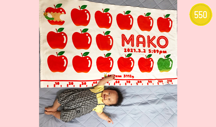 毎月2日に成長記録として写真に収めています。 4歳の長女は、タオルを広げて、よくりんご屋さんごっこをして楽しんでいます!