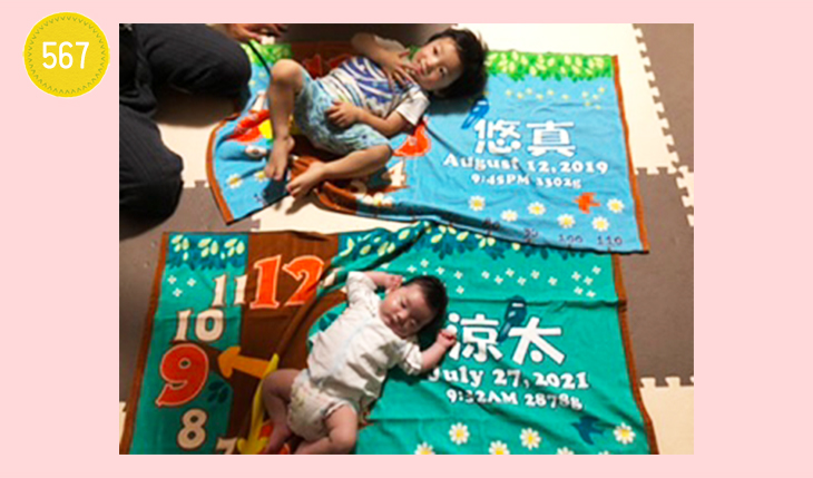 こちらのタオルは月齢誕生日ごとに写真撮影にも使わせてもらっています。 また、今の時期のタオルケットがわり、もう少し肌寒い時期には散歩用のおくるみとしても使っています。 散歩中や病院でも、知らない人からも「素敵なタオルね!」と声をかけていただいたり、家に遊びに来た友人からも、「これ生まれた時間入ってるの?すごいね。」などとよく言われます。 今治タオルなので肌触りもよく、とても記念にもなり、大切に愛用しています。