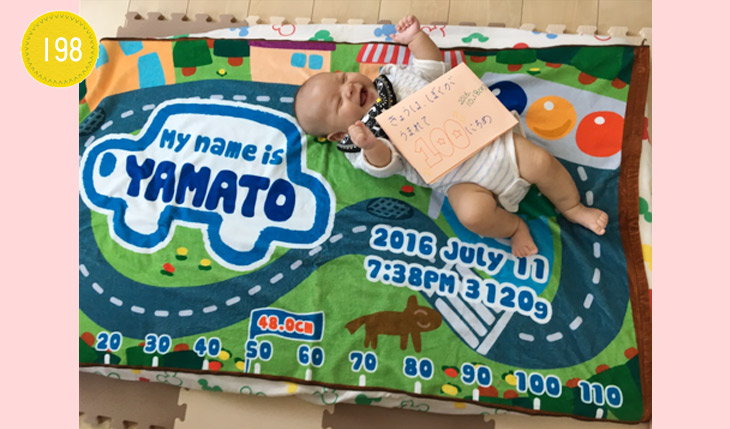 百日のお祝いに、オリジナルバスタオルとロンパースがばぁたんから届きました。